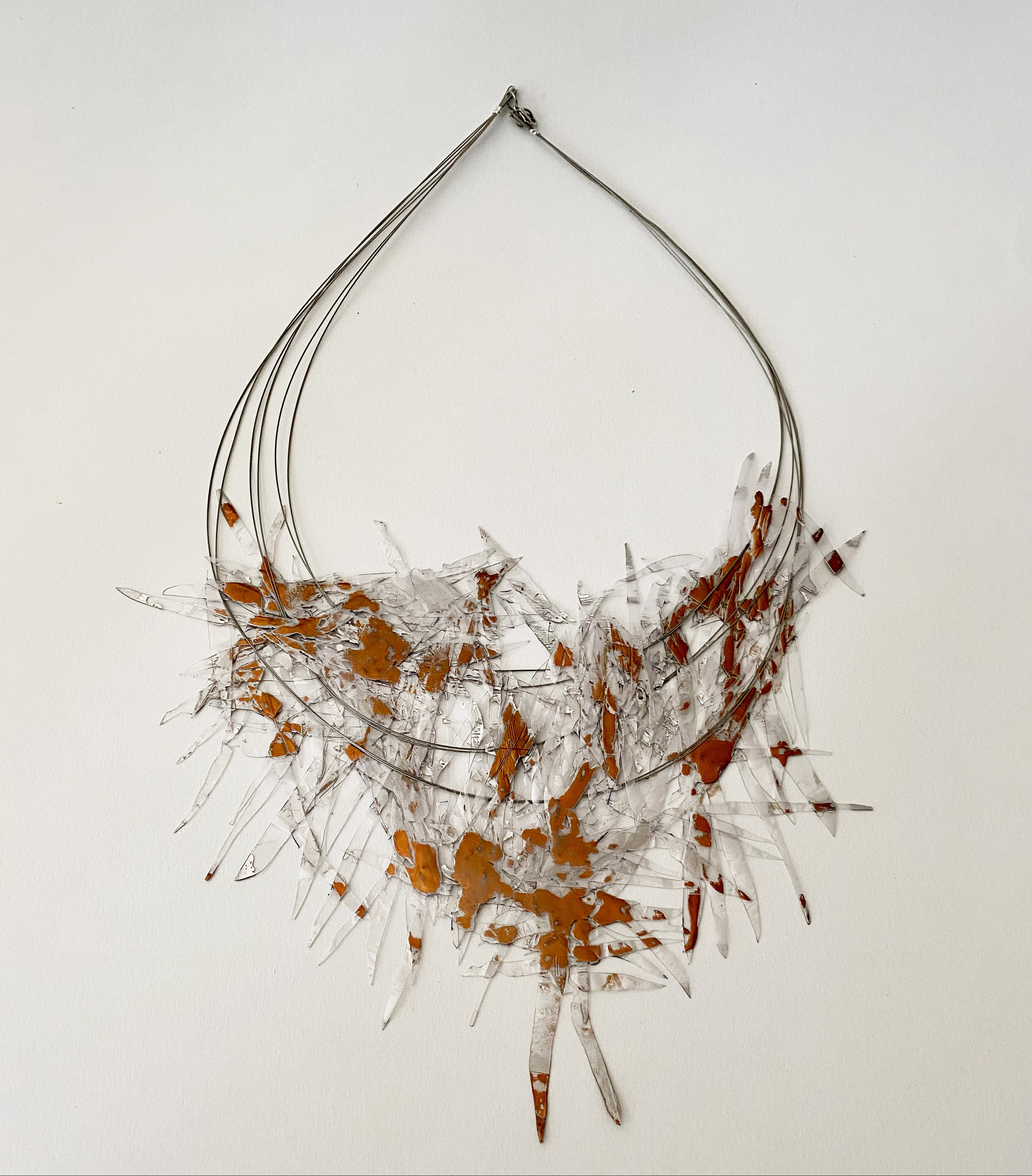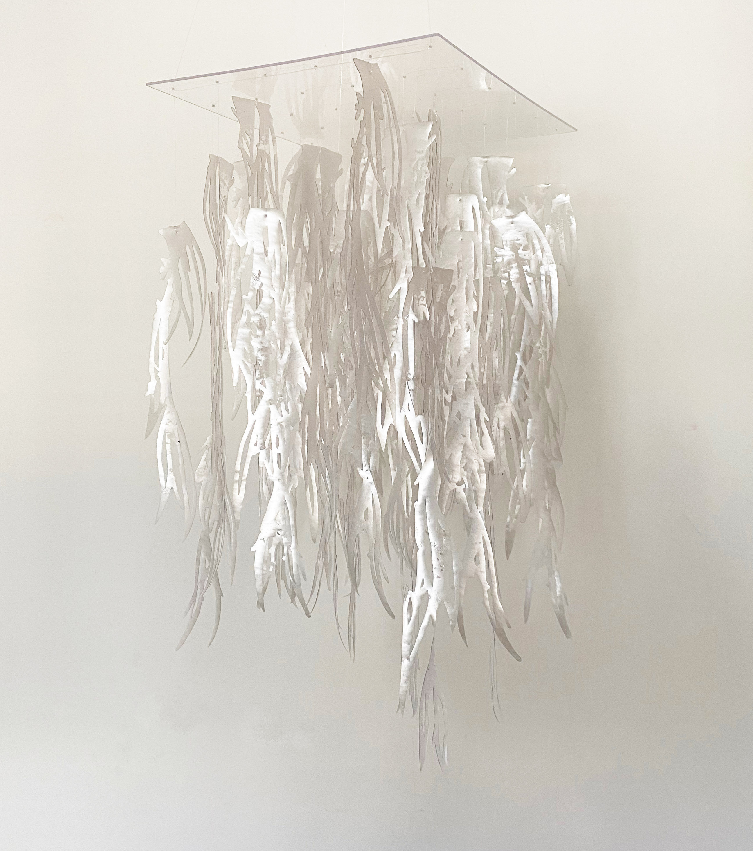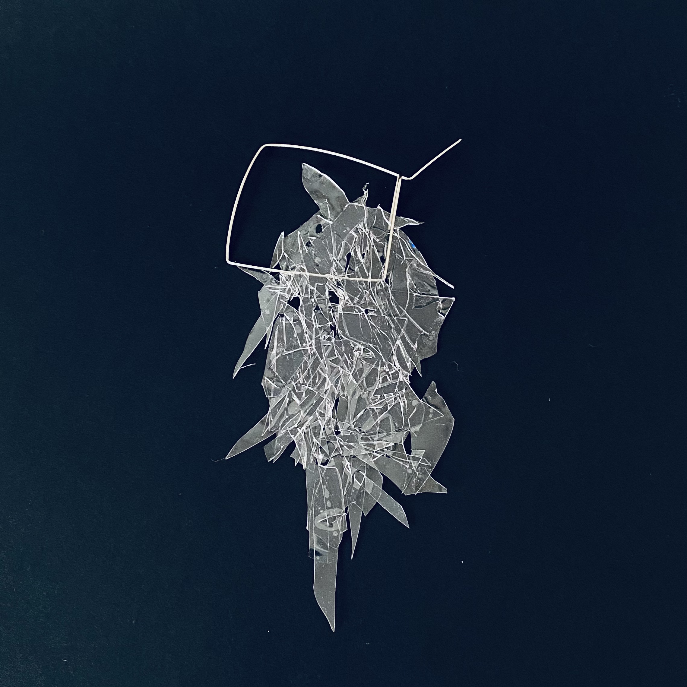 Entonces, a partir de un resto de vinilo cristal de 1,50 x 1,50 m que sobró de una obra anterior, busco producir una serie de obras que tengan sentido en tanto serie, hasta agotar el material. Esto hace que los restos que van quedando sean cada vez más pequeños y requieran de otra aproximación: algunas surgen por calado, otras por acumulación, … van apareciendo pequeñas obras, objetos y piezas de uso.