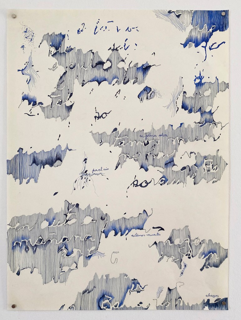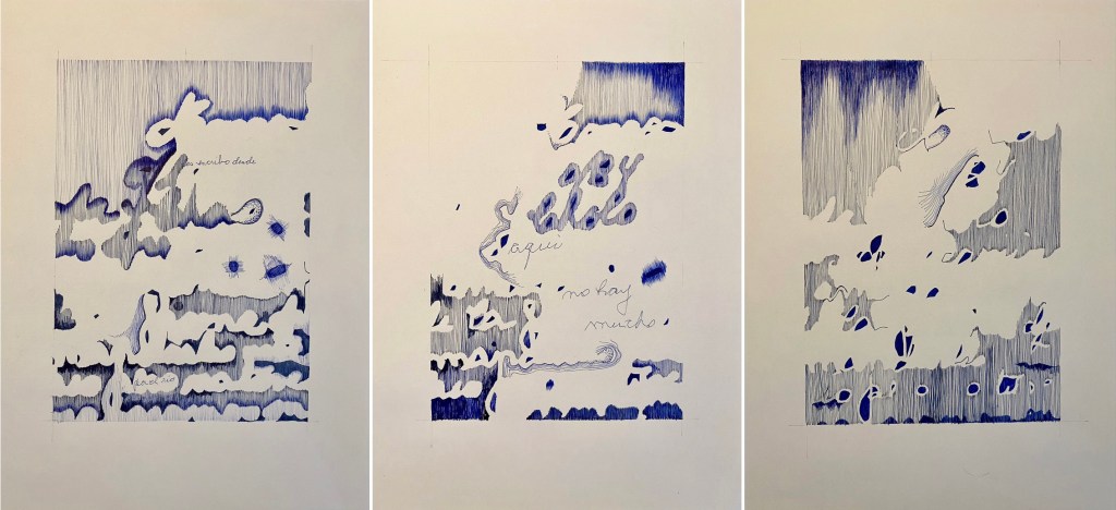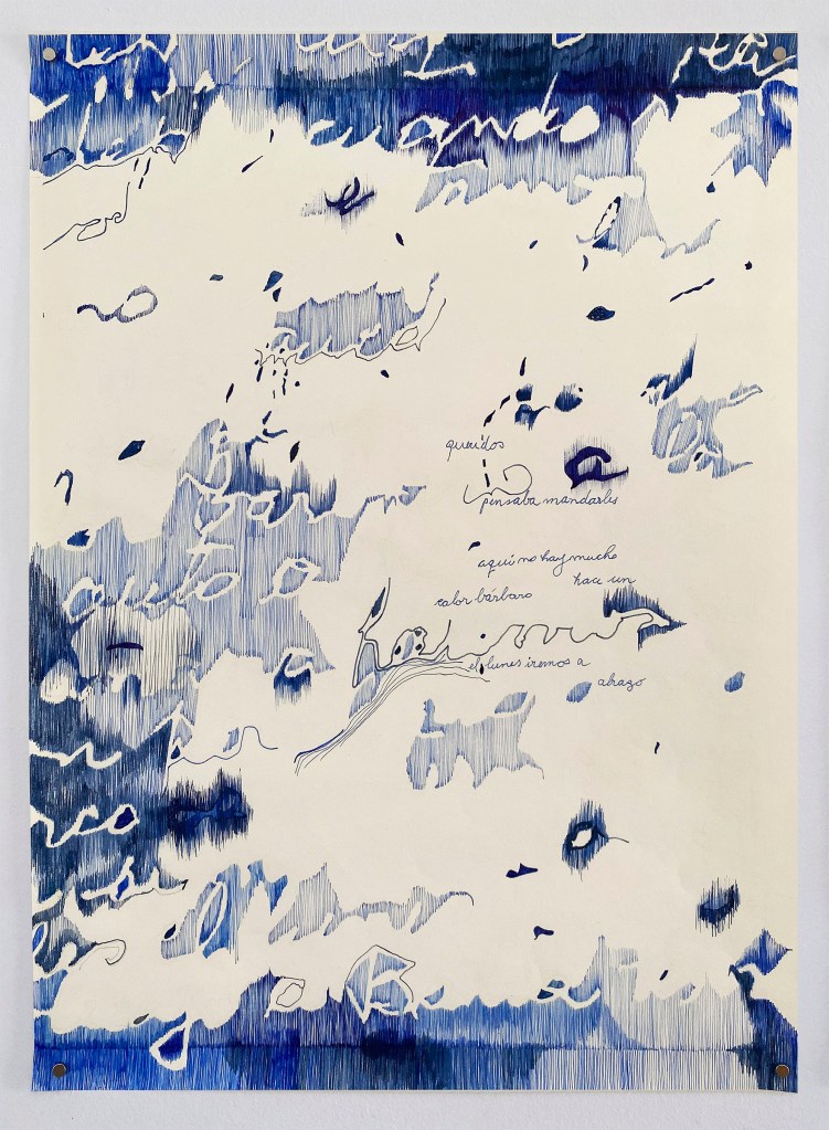Estos dibujos se generan a partir de aquellas escrituras espontáneas, que aparecen en los papeles cotidianos que habitualmente descartamos: boletas, comprobantes, listas de compras, postales, apuntes, recetas médicas, etc. El tipo de escritura que traen: apurada, incompleta, codificada a veces, desprolija, anónima, desprejuiciada, involuntaria, dubitativa, … es la base de mis dibujos.