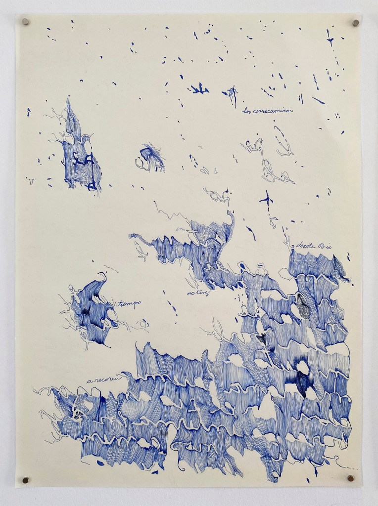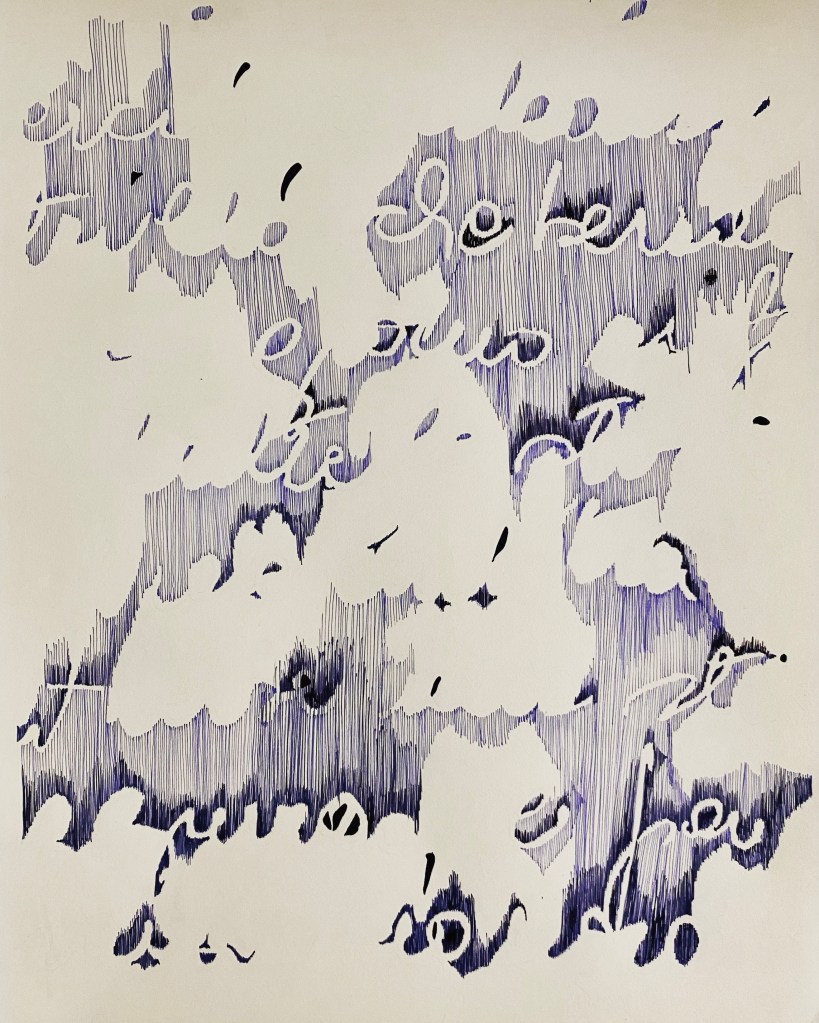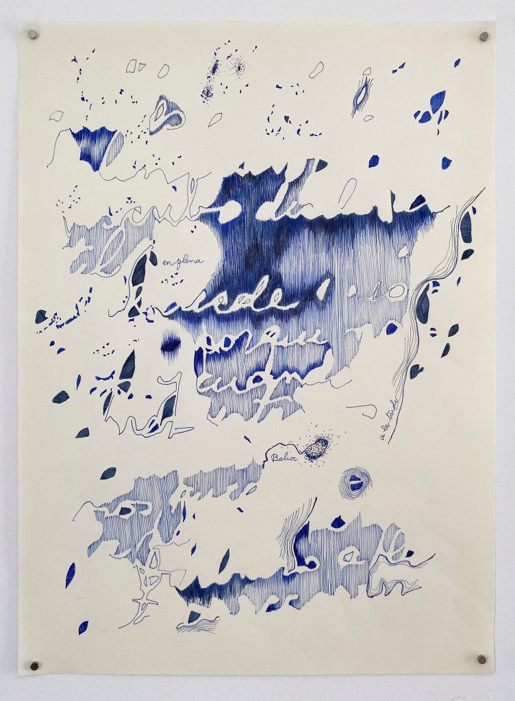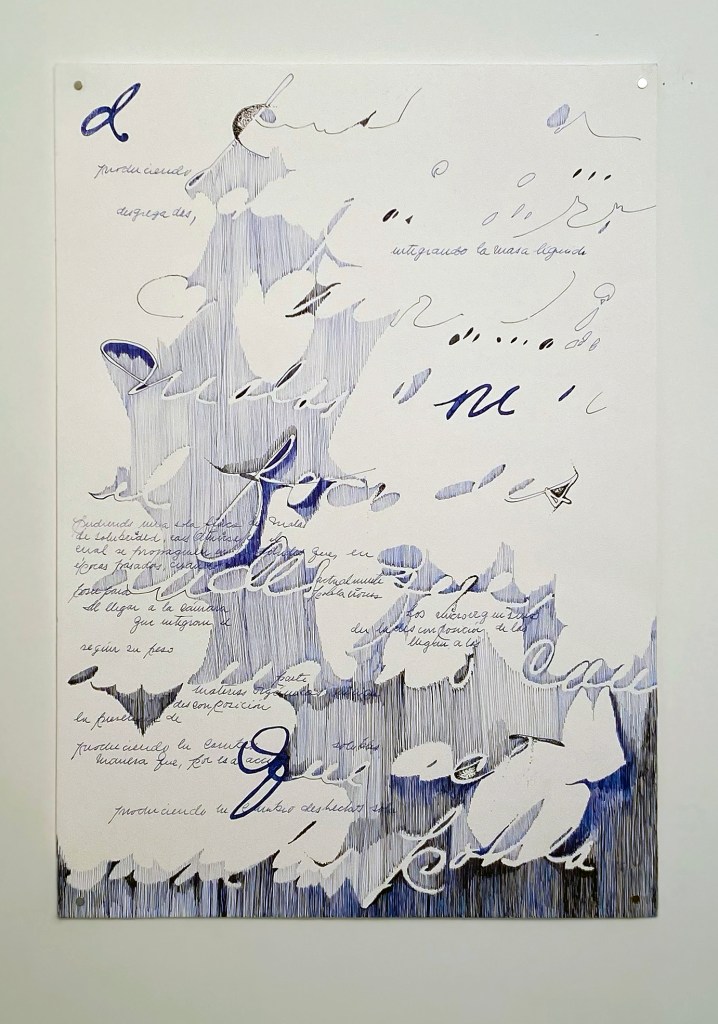 Trabajo sometiendo el material a operaciones sistemáticas sin prefigurar el resultado, vectorizando la escritura buscando producir un extrañamiento entre significante y significado. Así genero las bases que luego utilizo para dibujar a mano, también de forma sistemática: trazo, borro, copio, tacho, … todas operaciones asociadas a la idea escribir.